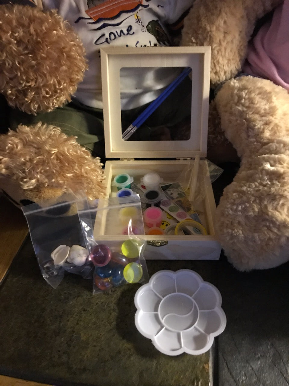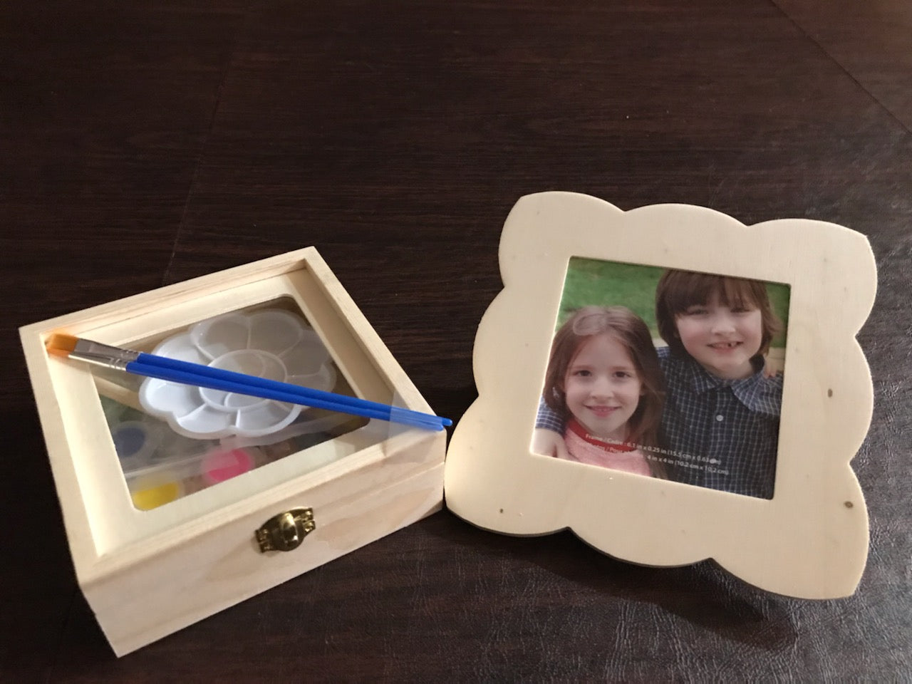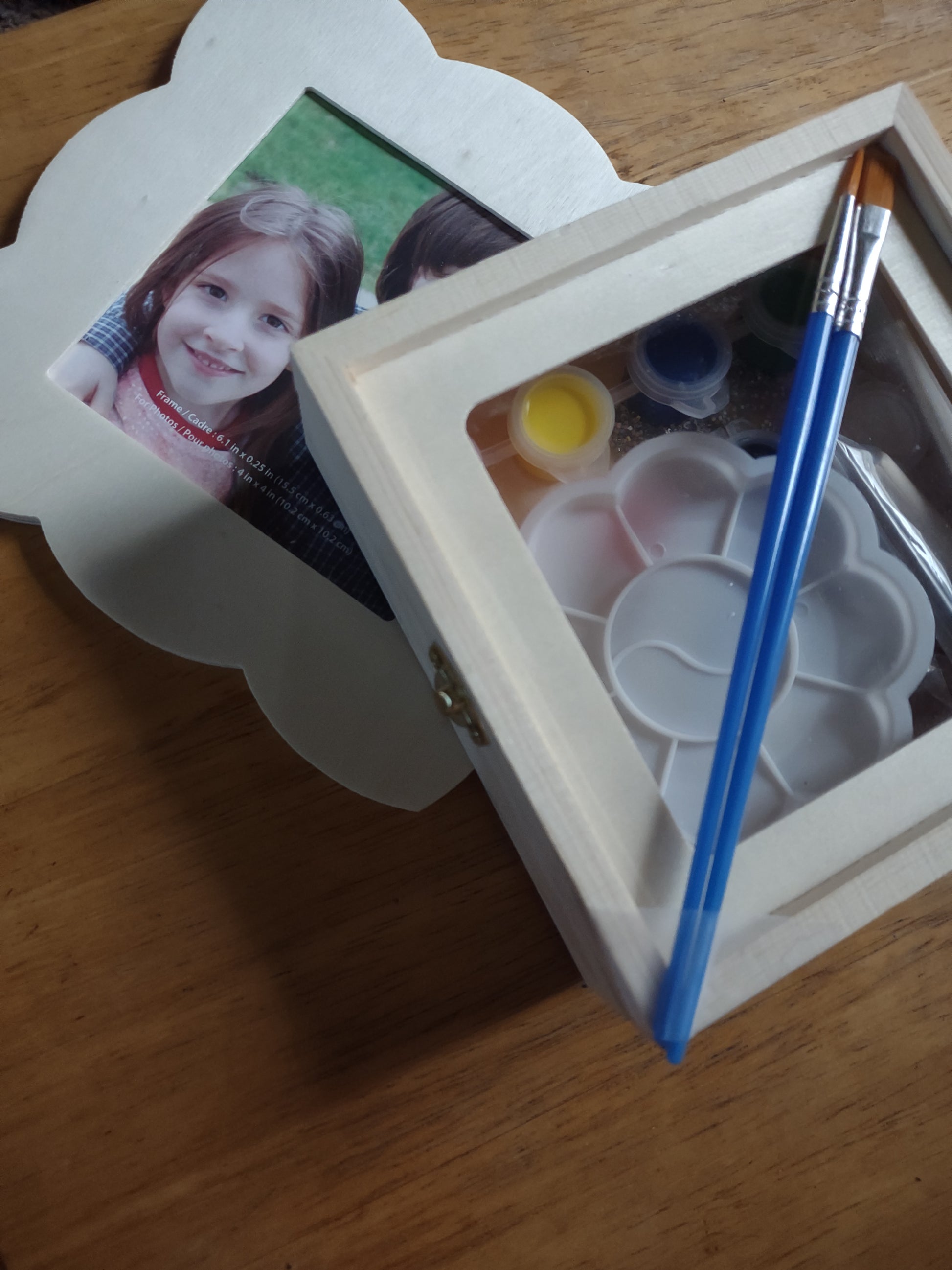 This craft kit is perfect for kids aged 4 and up. It includes a wooden frame with a dowel, a treasure box with a latch, over 5 decorative elements, and a paint kit (featuring 8 acrylic paint colors, a paintbrush, and a detail brush). As a bonus, you'll also receive a mini paint palette and instructions/ideas for even more creative possibilities. Showcase your favorite photo or artwork in the frame to add a personal touch to your home or give as a special gift. And don't forget the treasure box - add a cherished picture or artwork on the inside cover and display it through the clear window on the lid. Fill the box with your most prized possessions or surprise someone special with a thoughtful gift. Get creative and personalize the outside with the included decorative elements to match your unique style.