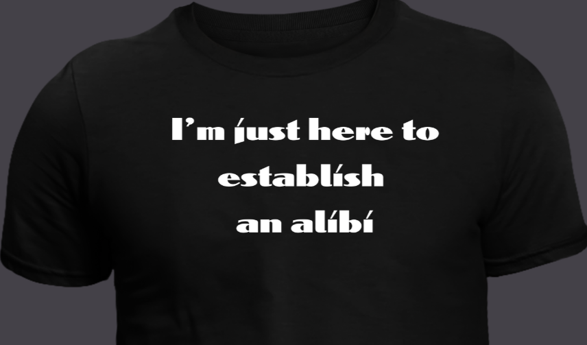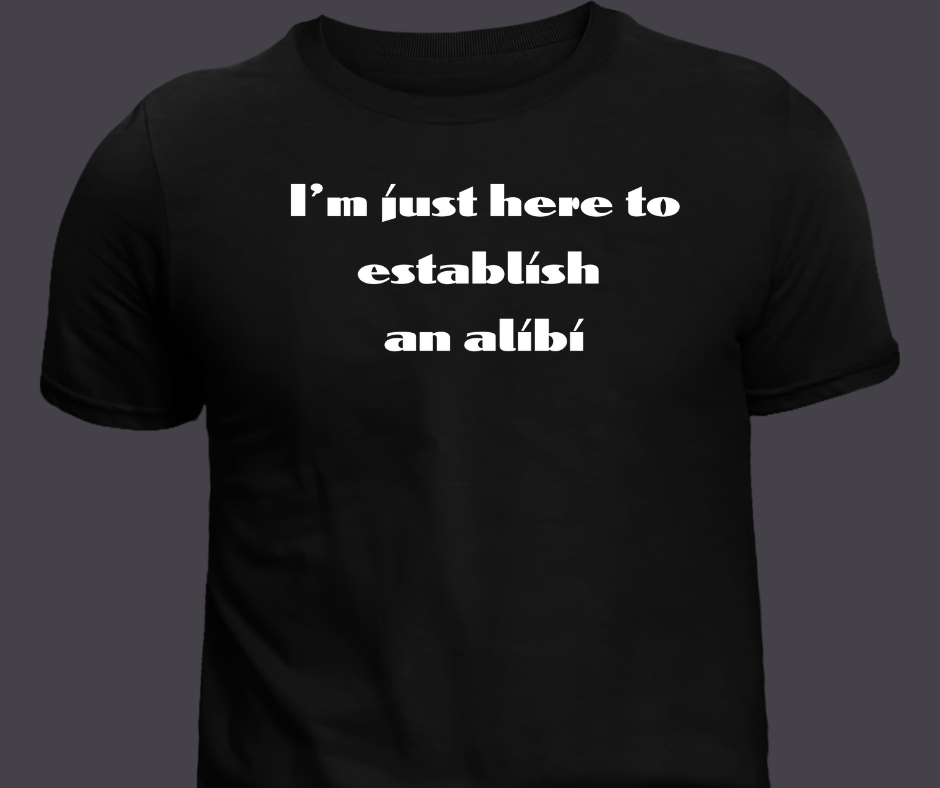 Know your way out of a sticky situation? Let this "Alibi" T-Shirt do the talking! Just pop it on and you'll be sure to create conversation -- after all, who doesn't want to know why you need an alibi? Fun for adults who are young at heart.