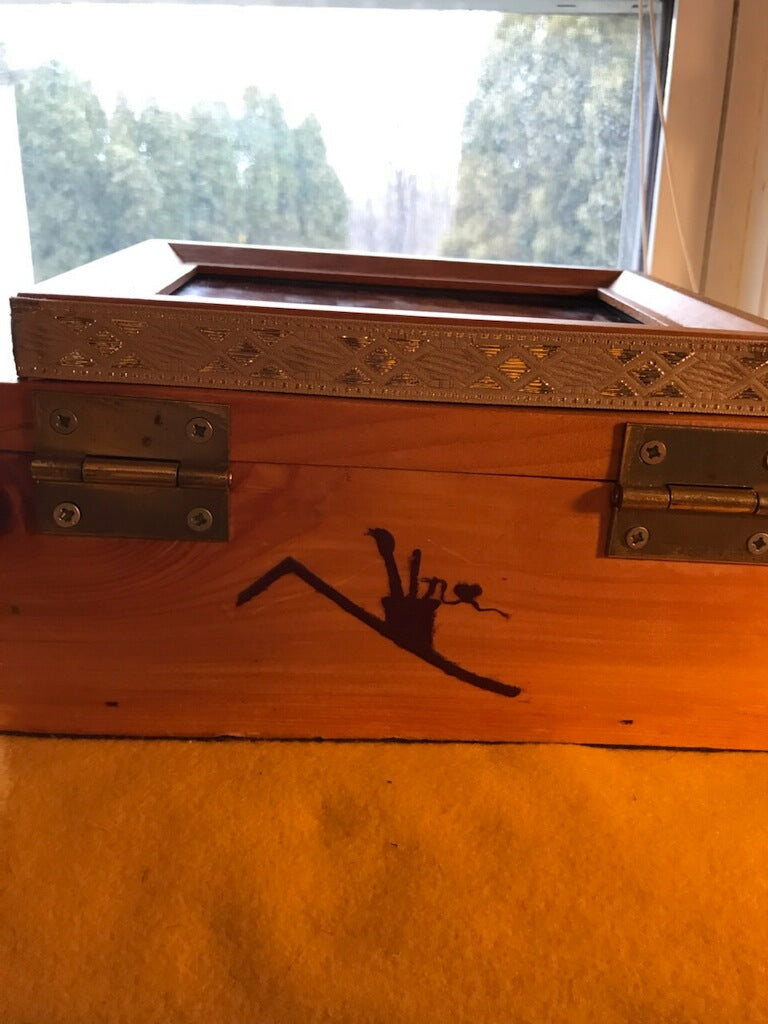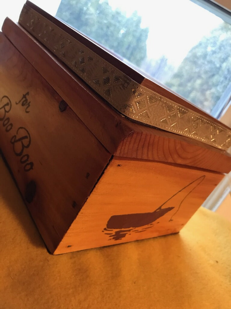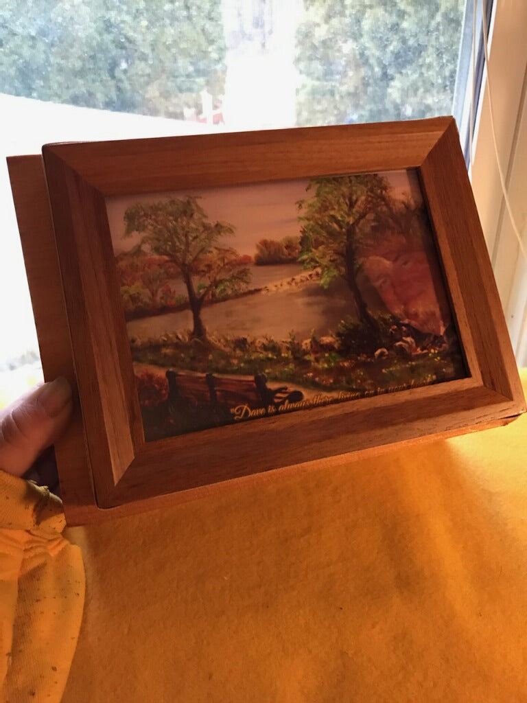 Introducing our Custom Memorial Box, a heartfelt tribute crafted with love and care to honor cherished memories of your departed loved one. This wooden hinged box is more than just a container; it's a vessel of remembrance, designed to encapsulate the essence of those special moments shared with your beloved. The lid features a framed print with the image of your cherished loved one digitally blended into the original painting that captures their spirit. Inside, handmade ornaments meticulously crafted to represent personal memories await, serving as tangible reminders of the joy and love shared. Each box is adorned with hand-painted or stained exterior imagery that reflects the essence of the recipient and their cherished connection with the departed soul. Accompanied by a personal note from you to the recipient, this Memorial Box is a touching gesture of love and remembrance.