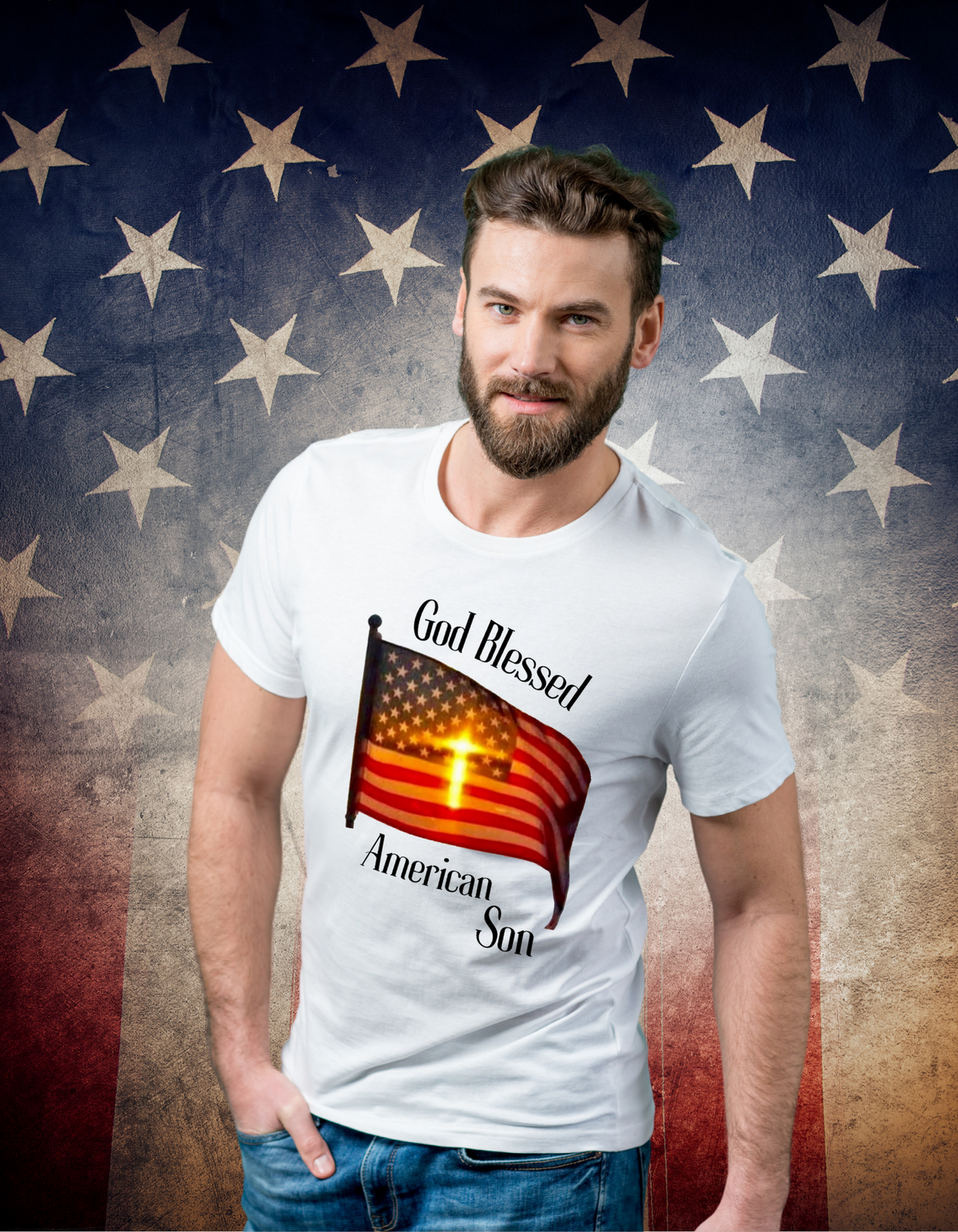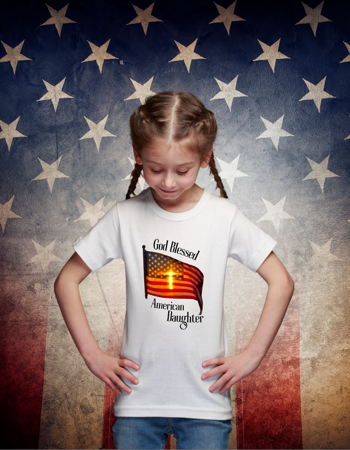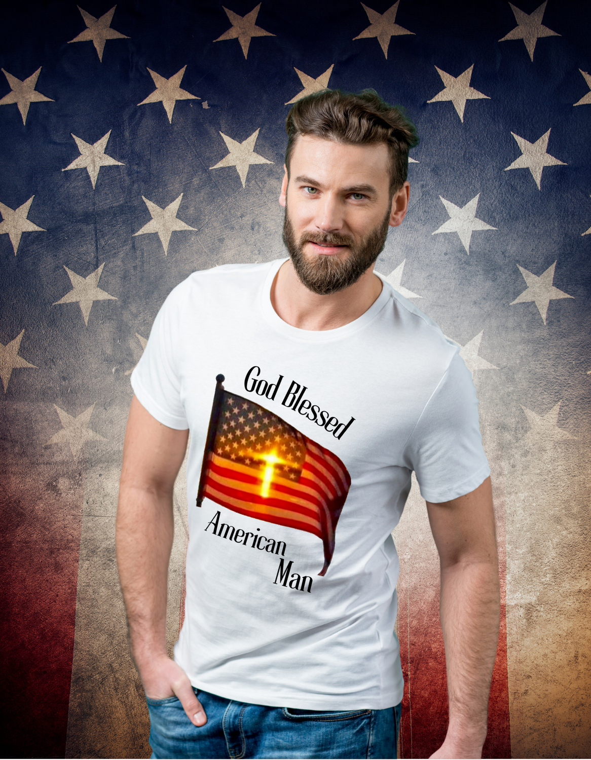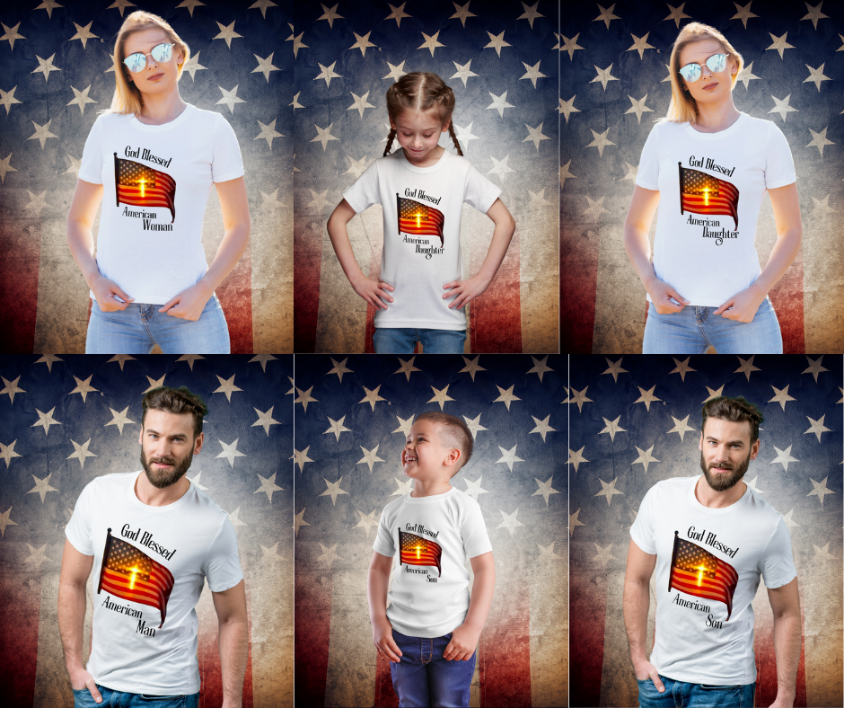 Show your patriotism with our exclusive "God Blessed American" collection of T-shirts. Crafted in the U.S.A., these Youth & Adult sizes are perfect for displaying your American pride & faith. Four design options — Man, Woman, Son, & Daughter - let you honor our veterans and country in style! Who says patriotism can't be fashionable?