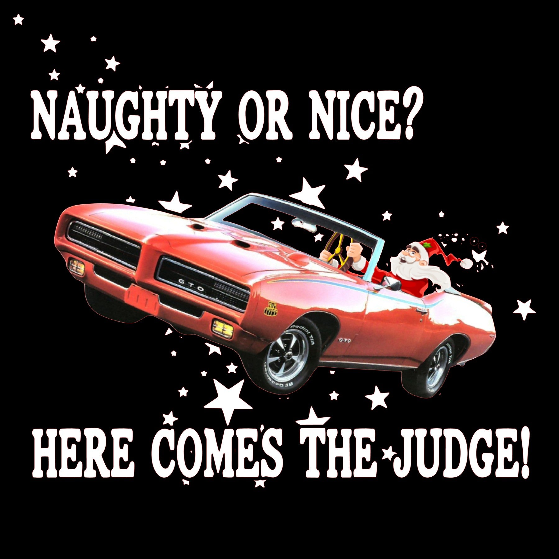"Naughty or Nice? Here Comes The Judge!" Adult Long Sleeve T-shirt. Santa likes Hot Rods, too! Check out his GTO Judge Sleigh. Perfect gift for that Classic Car Lover in your life!