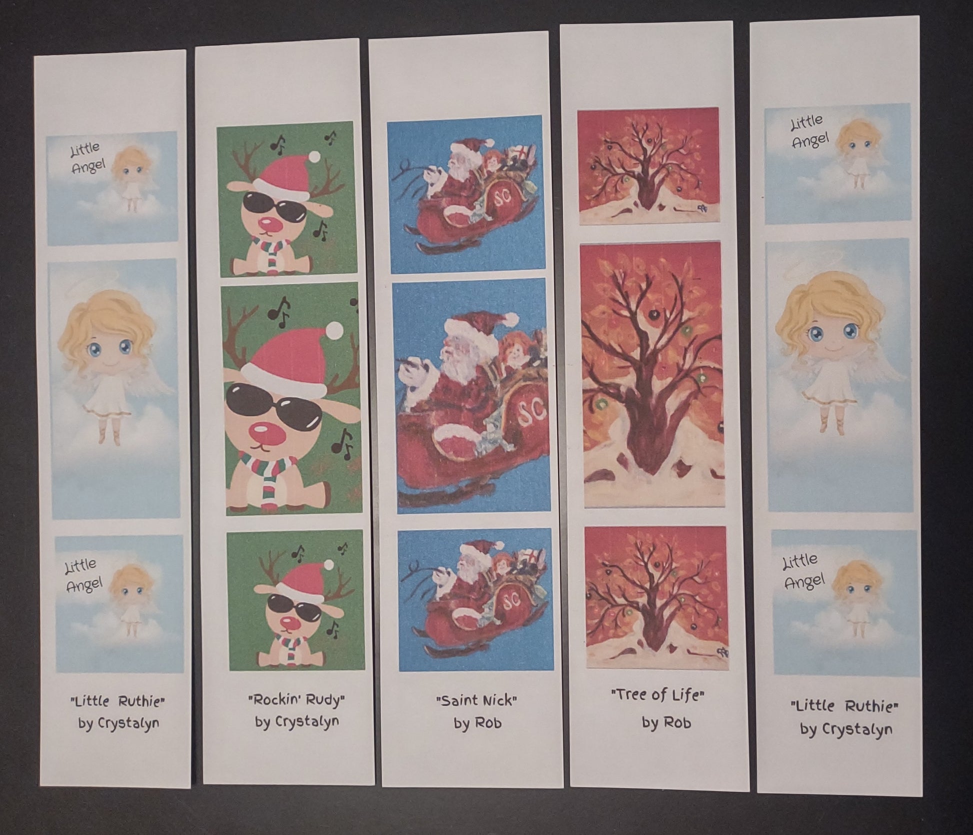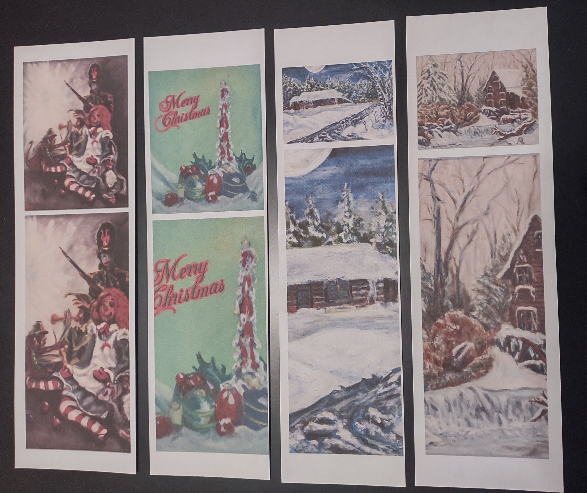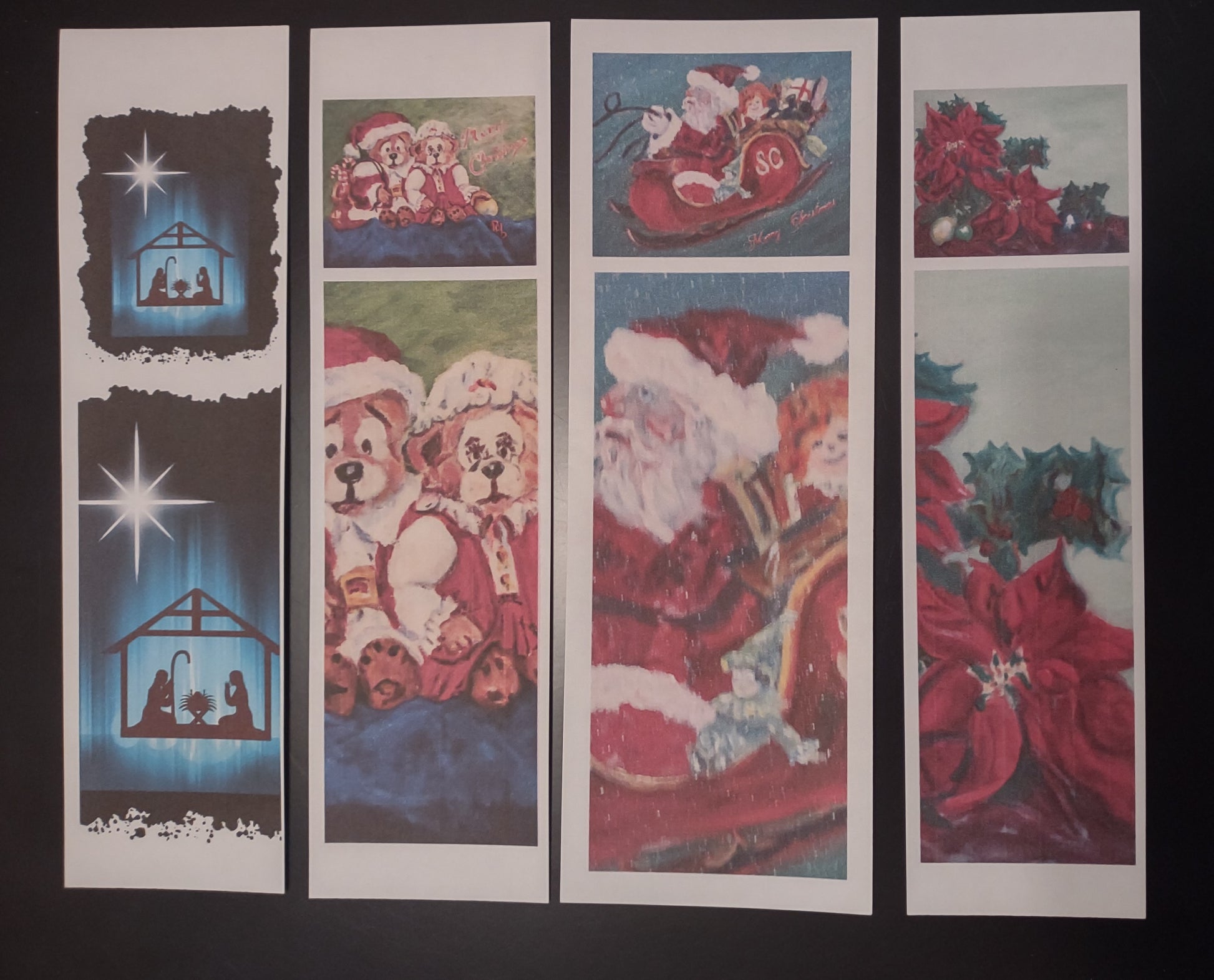 *Original Art/Graphic Bookmarks$0.99 each ["Angel", "Rudy", "Santa-3", "Tree", "Santa-2", "Nativity", "Poinsettia", "Bears", "Nutcracker", "Candle", "Cabin in Moonlight" (blue), "Winter Cabin" (brown)]